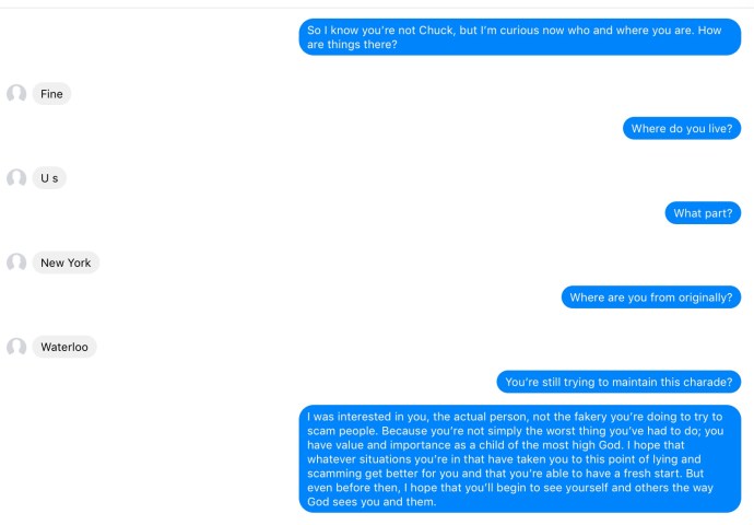 He dropped the charade but never told me his real name, although he did eventually share that he was from Nigeria; he was very surprised that I have been there and remember the people fondly. At one point, he said he would like to study to be a doctor, an aspiration that (whether sincere or strategic) highlighted the good and bad in each of us. By the end of it all, I called him “my friend,” wished him well, and said he could message me any time he wanted to talk again. In the morning, I even went back to greet him, but Facebook had booted him from Messenger for being an impostor.