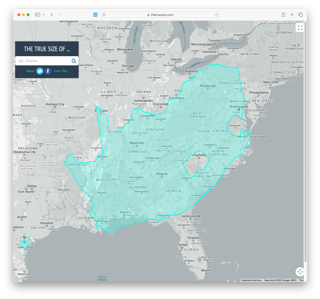 https://www.thetruesize.com/#?borders=1~!MTM1Nzk0MjI.MTEzNDk4MzY*MTE1NzQ2Mzg(Nzk5NTI5Mg~!CONTIGUOUS_US*MTM2MjM1MDA.MjgxODUyODI(MTc1)MA~!ZA*MTM1MDM4NjE.MTA2NzYxMjQ)MA